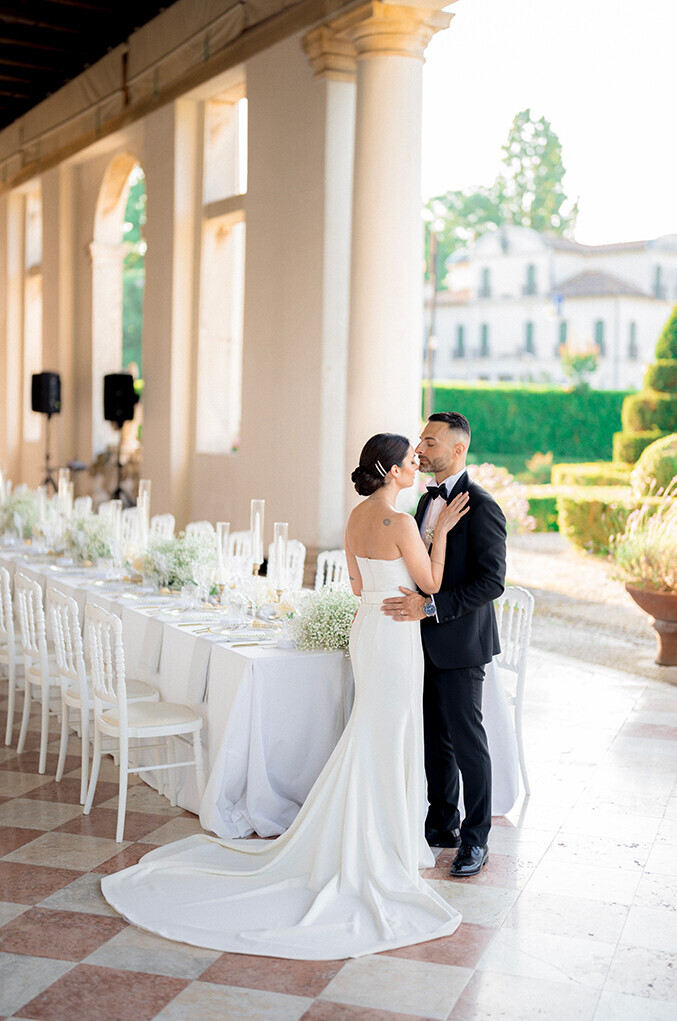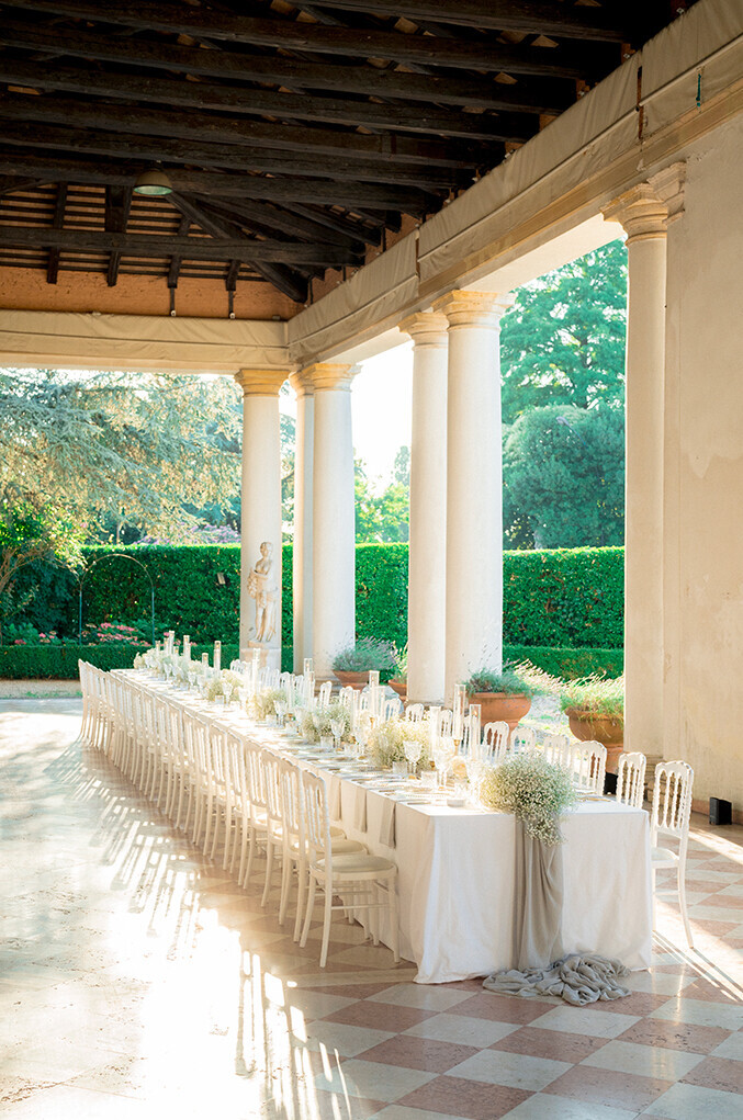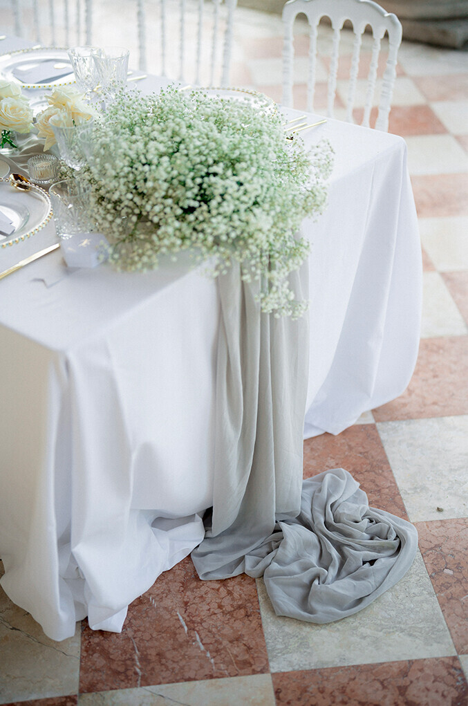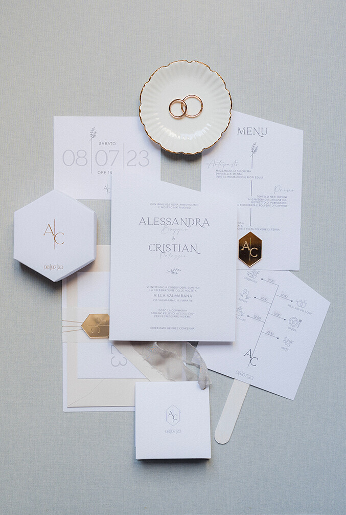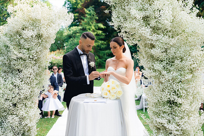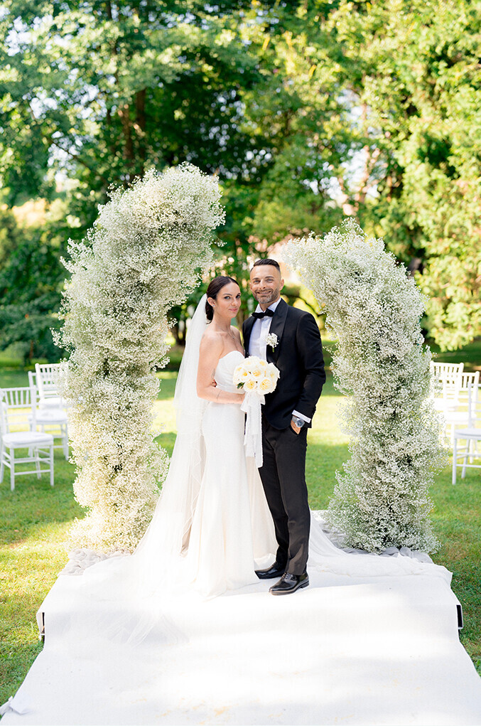 Nell’incantevole cornice di Villa Valmarana, residenza del ‘600 nella Riviera del Brenta, Alessandra e Cristian hanno convolato a nozze con una romantica cerimonia civile nei curatissimi giardini della venue avvolti in una scultorea scenografia floreale di gipsofila, infiorescenza che ha accompagnato l'intero evento, una leggerezza bilanciata da una nota di carattere stilistico grazie alla creazione moderna e geometrica della stationery e degli accessori.