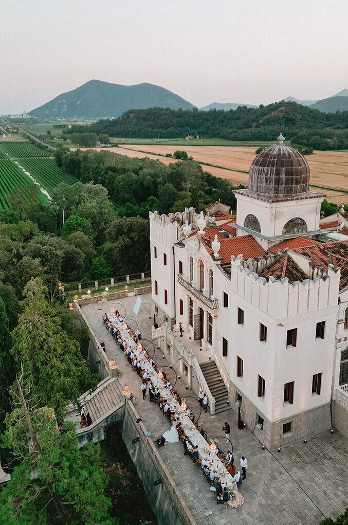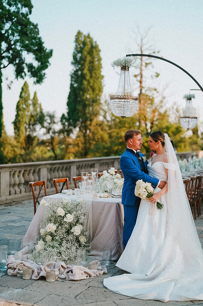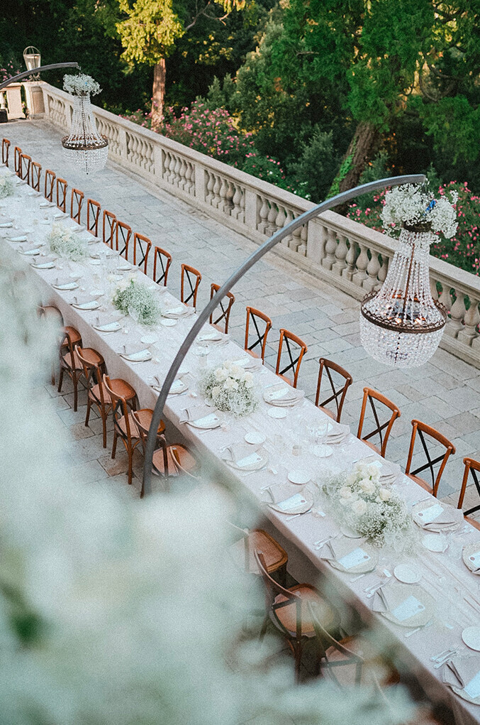 Il lussureggiante placè, con tavolo imperiale arricchito da prestigiosi lampadari ad arco, ha riscaldato la cena sulle storiche terrazze della villa dell’800 regalando agli sposi e ai loro ospiti un indimenticabile ricevimento con un panorama mozzafiato.