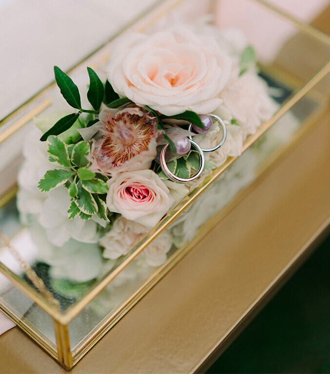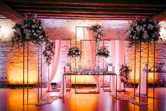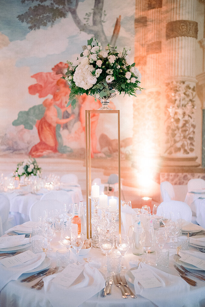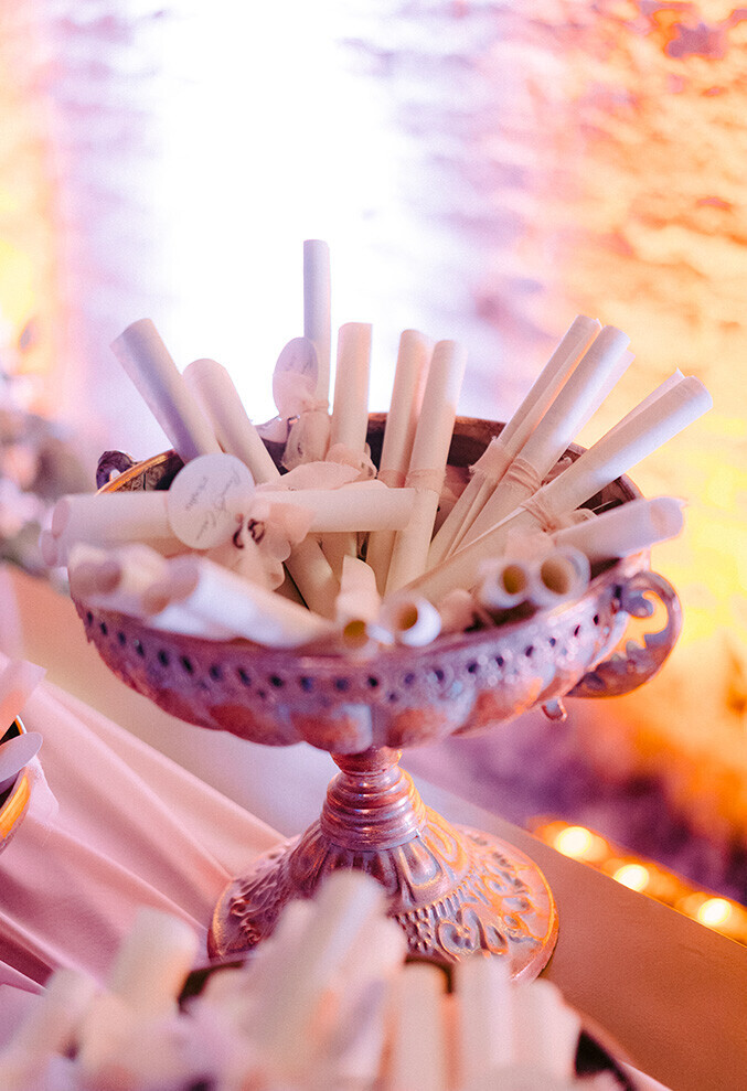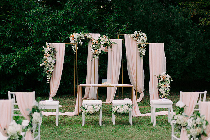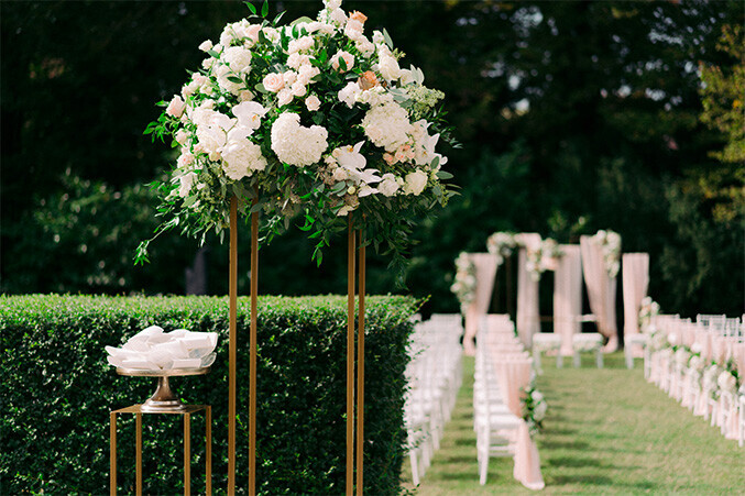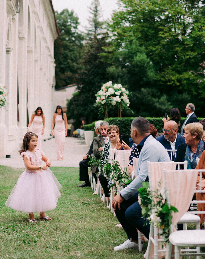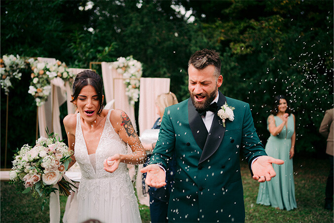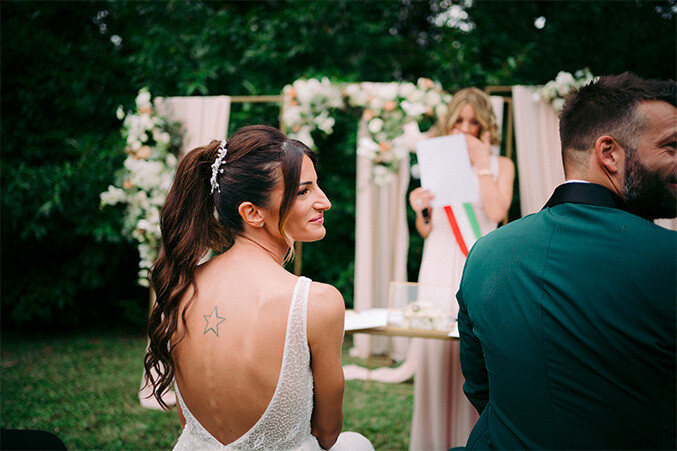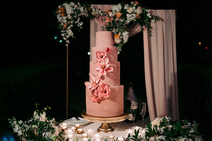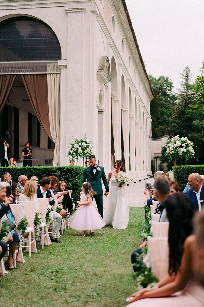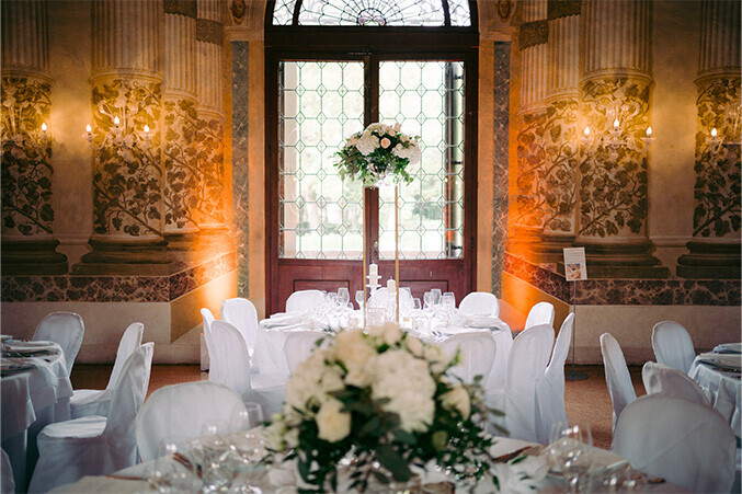 Ilenia ed Enrico hanno scelto di sposarsi con un rito civile nella splendida location di Villa Foscarini Rossi di Stra; un venerdì di fine settembre, in una fortunata giornata perfetta, tra le corde di un’arpa e una celestiale voce femminile il giardino sembrava il set di uno sfavillante film americano. Enrico nel suo affascinante abito verde smeraldo di Enzo Miccio, Ilenia radiosa nella sua silhouette impeccabile hanno dato via ai festeggiamenti accompagnati da scenografie geometriche dorate impreziosite da leggeri tessuti di un delicato color rosa caldo.