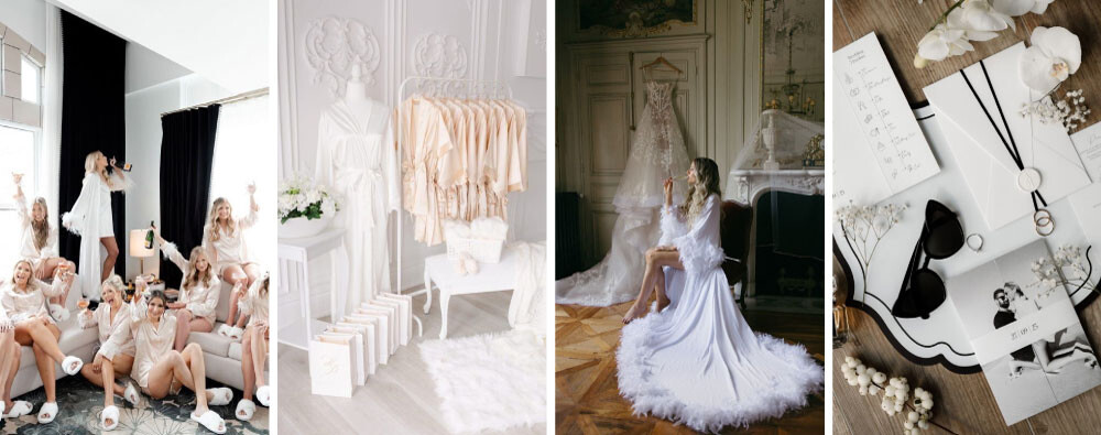 Anche l’outfit della preparazione contribuisce all’estetica del giorno: una vestaglia bianca o un completo in seta valorizzano la sposa fin dai primi scatti.
